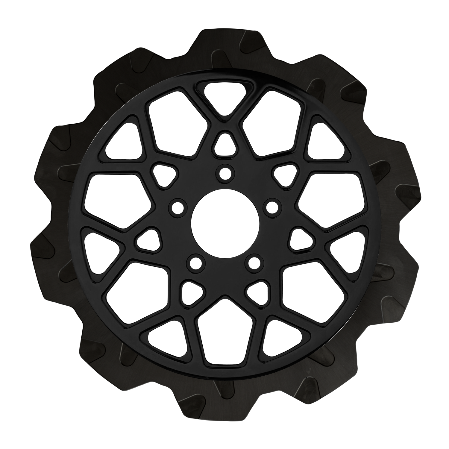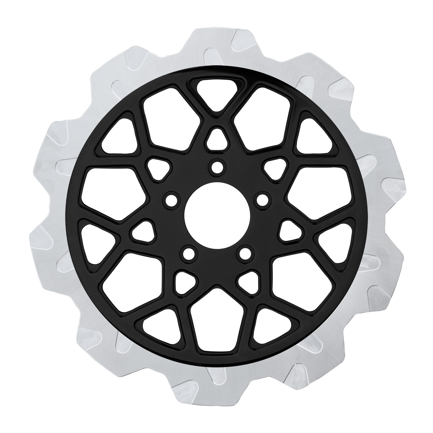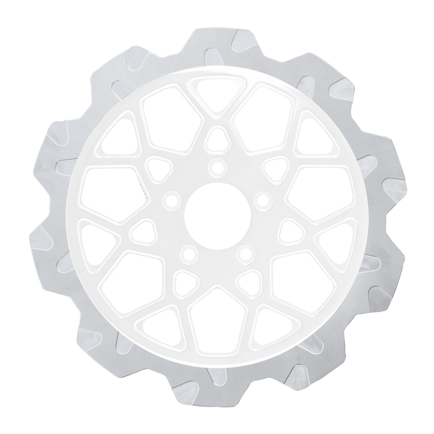 The reduced weight of Lyndall Crown cut rotors enhances rider control by minimizing rotating mass, while the incorporated gas slots effectively outgas debris and gasses generated during friction, preserving the rotor's integrity against brake pad wear and aiding in cooling.