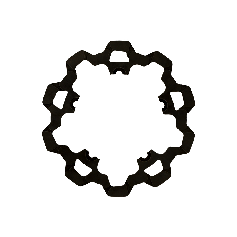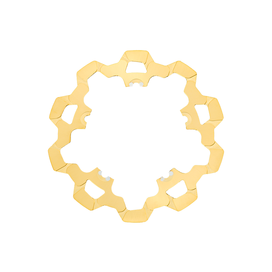 The reduced weight of Lyndall Crown cut rotors enhances rider control by minimizing rotating mass, while the incorporated gas slots effectively outgas debris and gasses generated during friction, preserving the rotor's integrity against brake pad wear and aiding in cooling.
