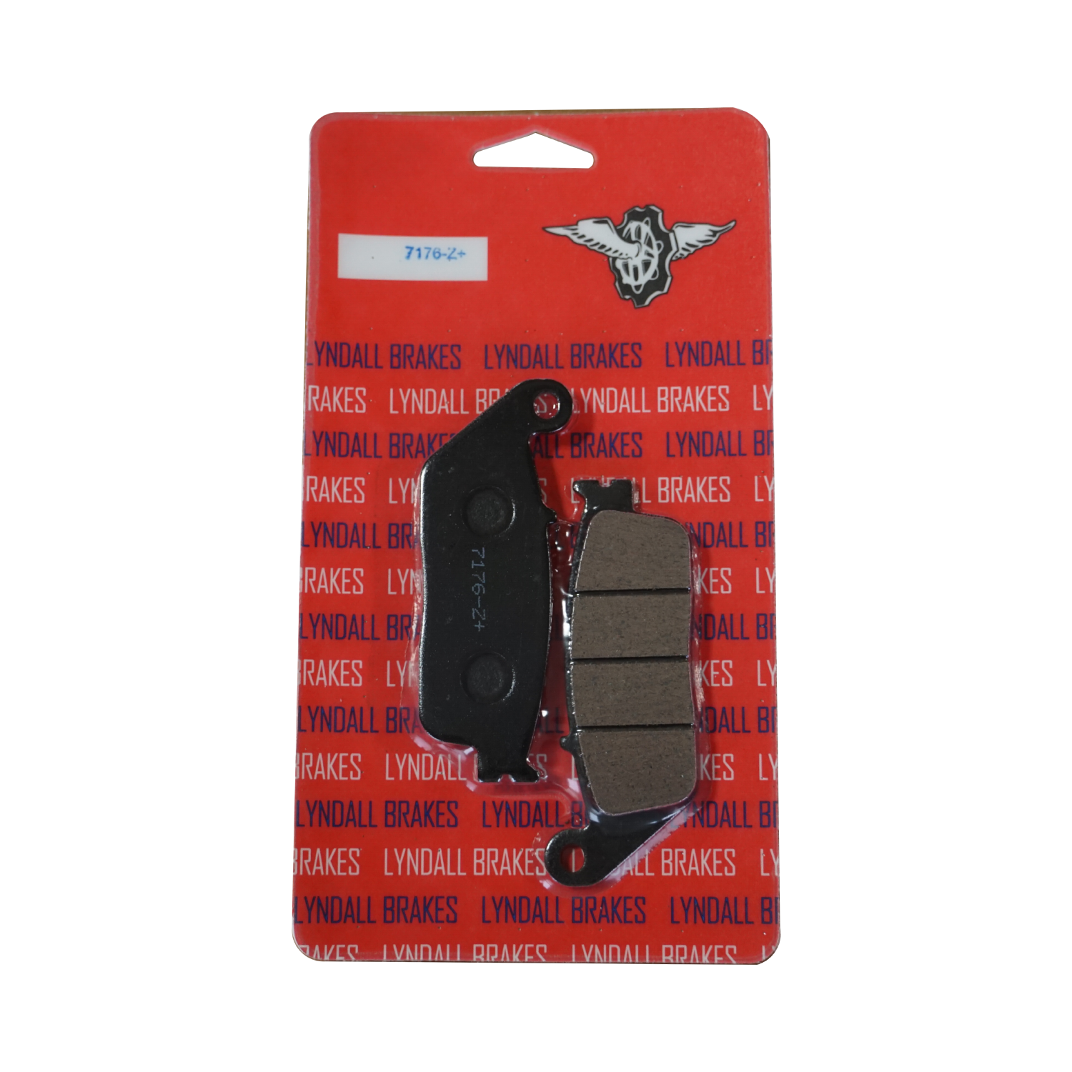 This is a great pad for putting on a stock Harley. Utilizing a specially formulated aramid compound, this tried and true brake pad will deliver 5% more stopping power than stock pads with Zero dust or noise. 30% cooler and 50% lighter than sintered pads. Note: If you want to protect the black finish on your Lyndall rotor, you must use our Z plus brake pads. (These also work great with polished rotors)