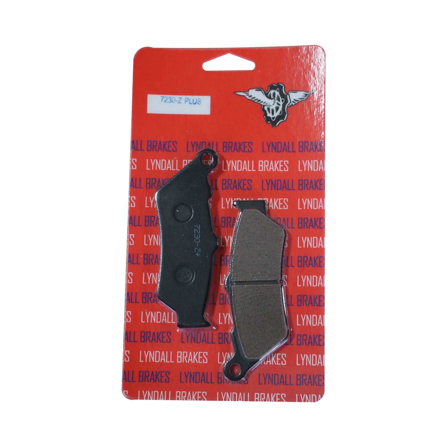 This is a great pad for putting on a stock Harley. Utilizing a specially formulated aramid compound, this tried and true brake pad will deliver 5% more stopping power than stock pads with Zero dust or noise. 30% cooler and 50% lighter than sintered pads. Note: If you want to protect the black finish on your Lyndall rotor, you must use our Z plus brake pads. (These also work great with polished rotors)